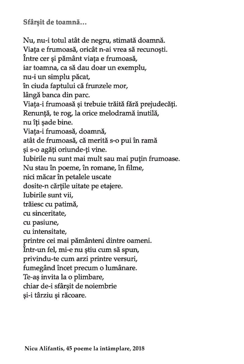 Te iubește cine / Nu te lasă să uiți / Că ești artă / Printre oamenii mulți. Te iubește cine / Te poate iubi / Când ție îți vine / Doar de tine să poți fugi. Te iubește cine / Te-a desenat cândva / Cu compasul inimii pline / De conturul simțirii, din inima sa. […]